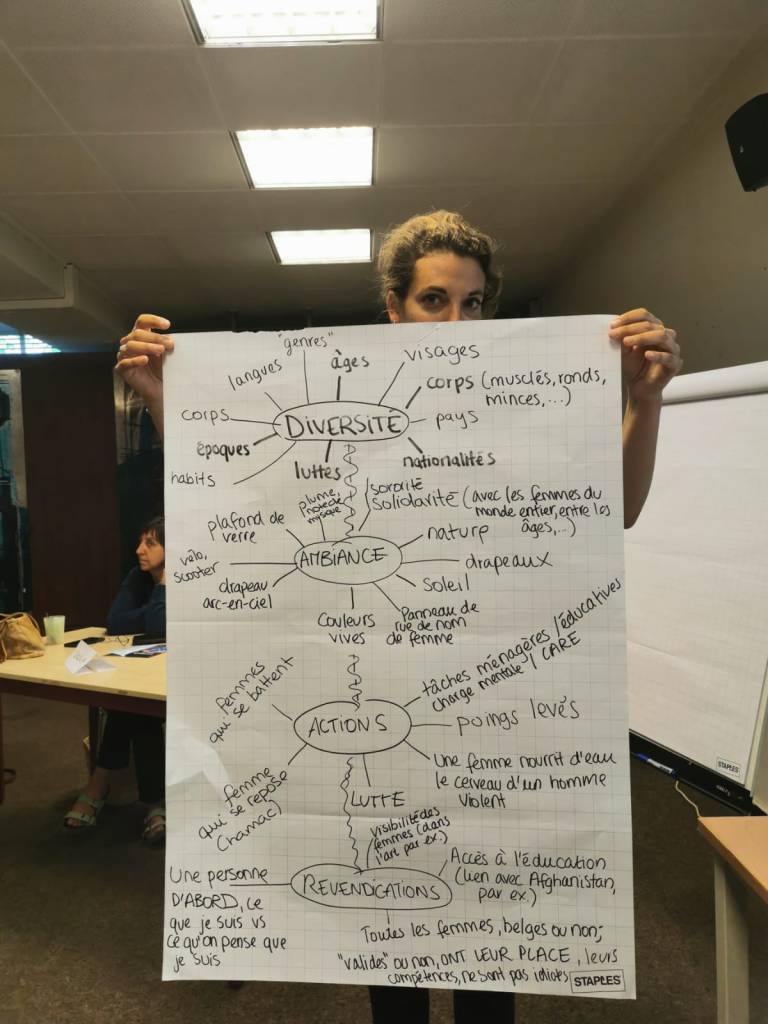 Trois ateliers de co-animation avec les associations PAC et FPS et un groupe de femmes habitantes de Verviers en vue de la co-construction d’un projet de fresque féministe.
