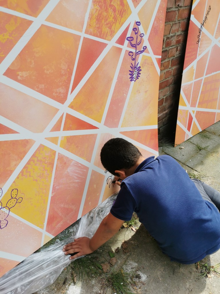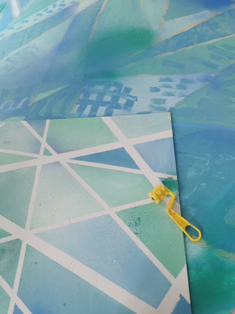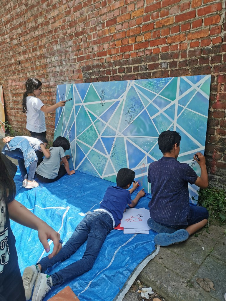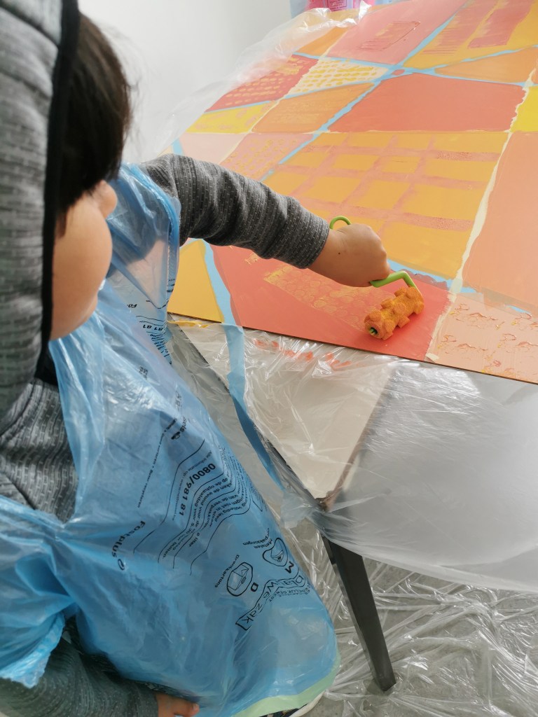 Les enfants ont d’abord crée le fond en peinture, entre formes géométriques et matiérage de toute sorte.