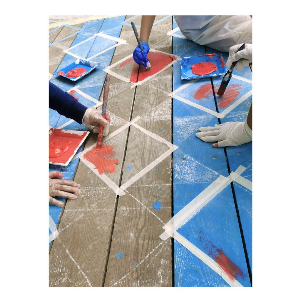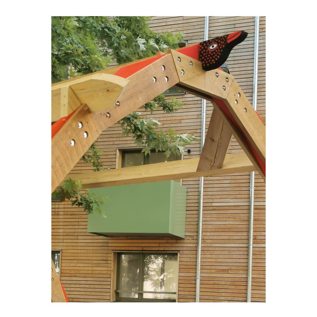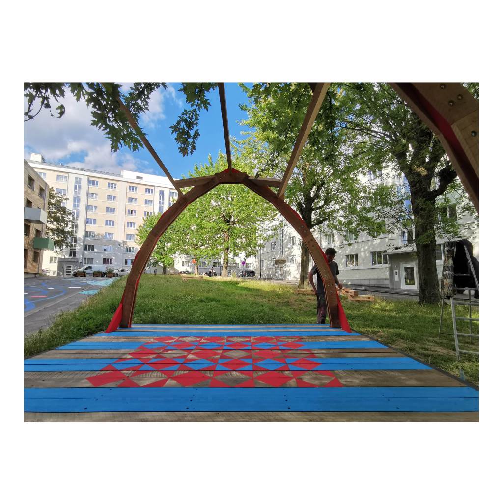 - Le Kiosque représente un navire, voguant sur la rivière peinte au sol, réalisée précédemment sur la thématique du cycle de l’eau. Cette structure permet aux enfants et parents de jouer où de se reposer, au choix!