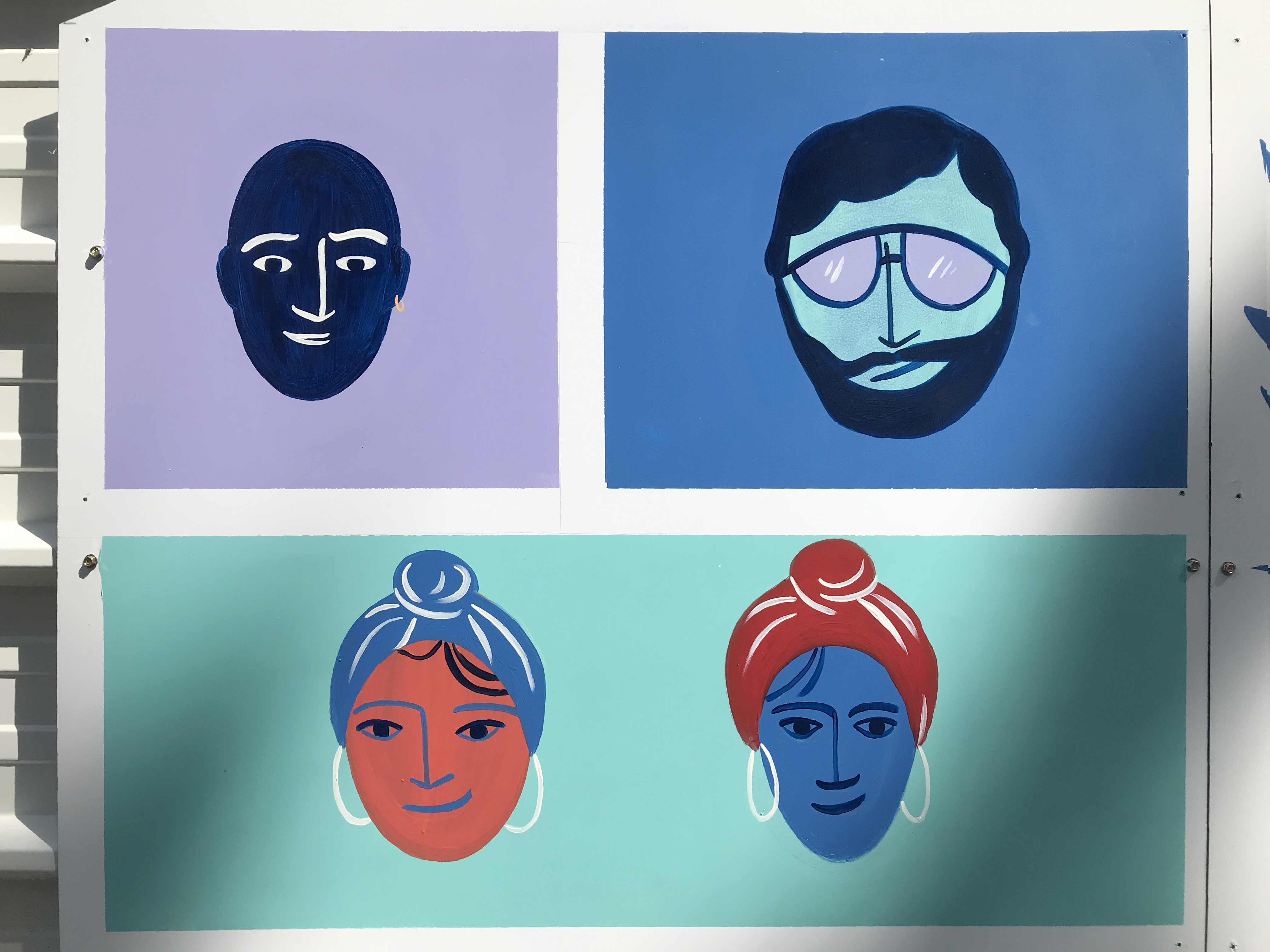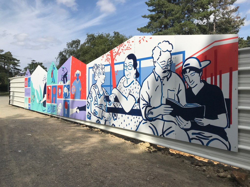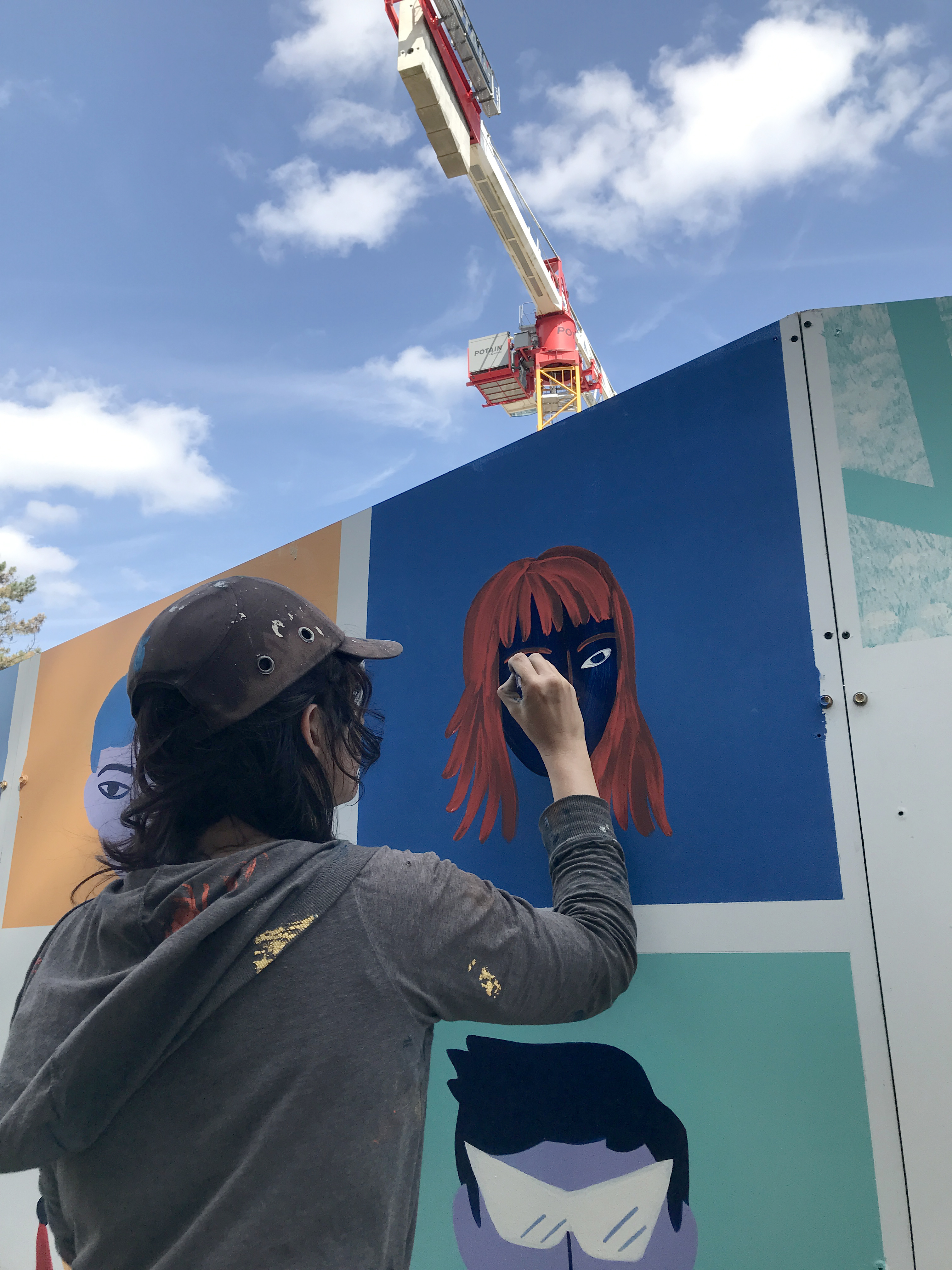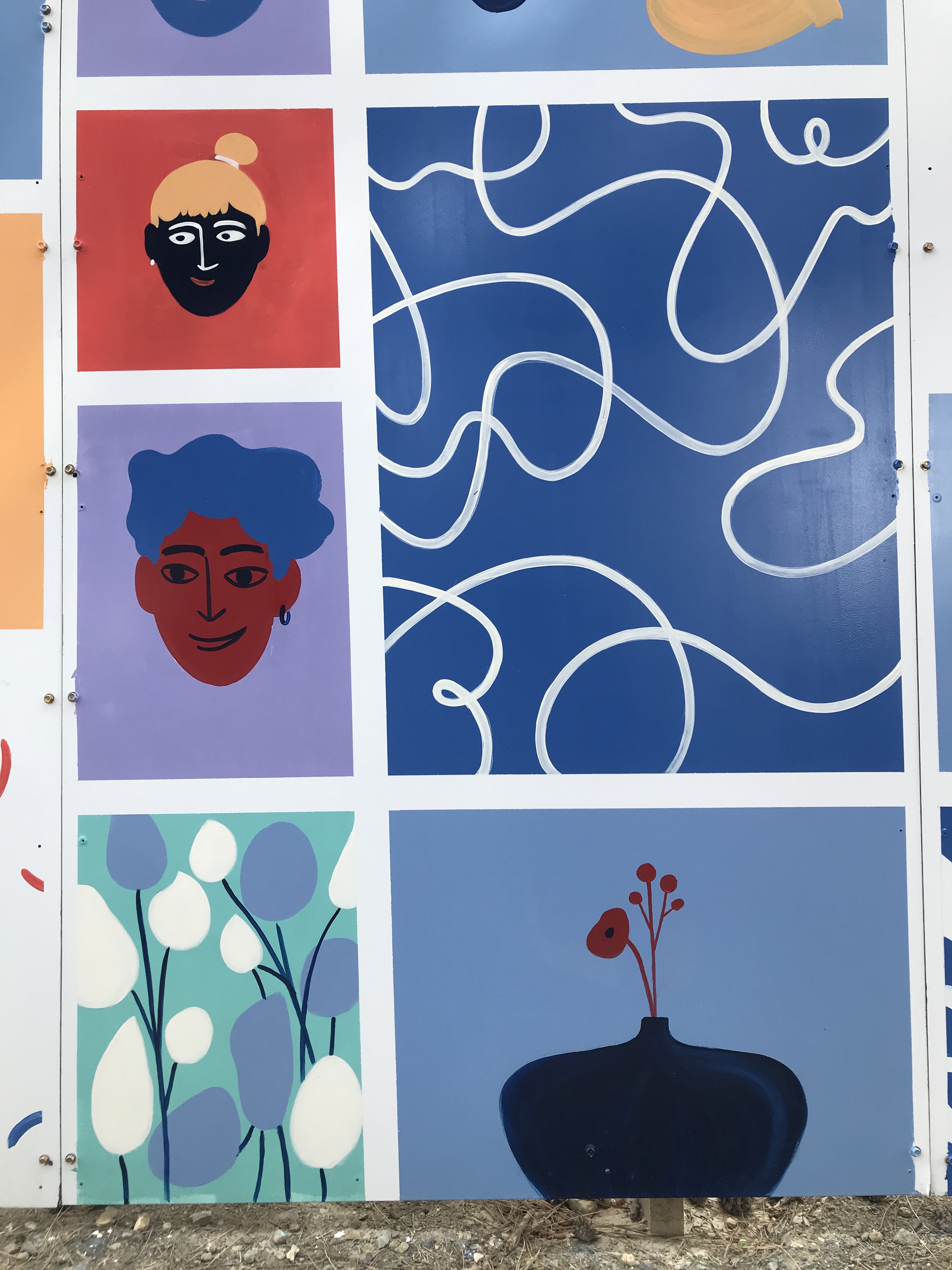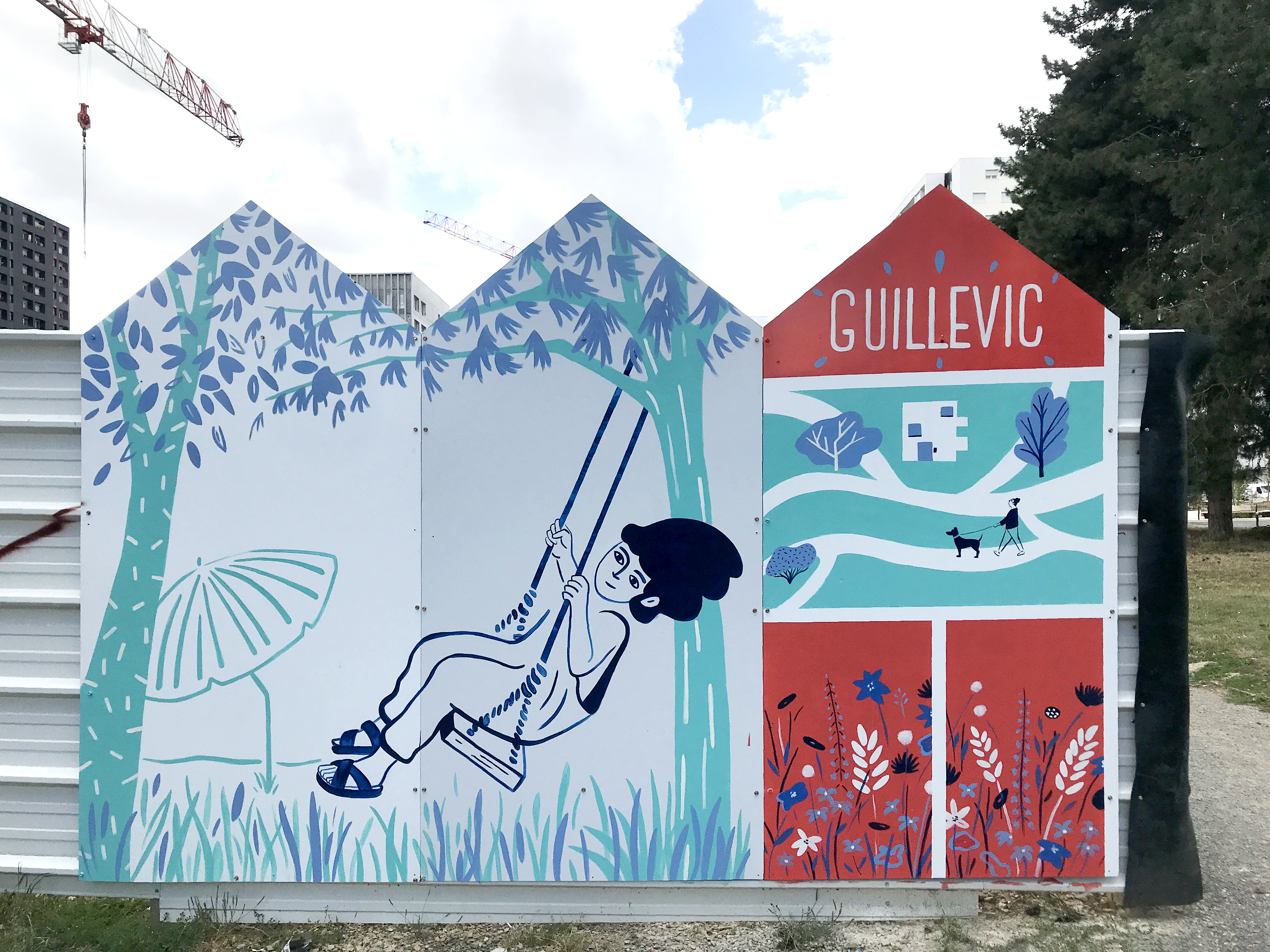 Afin d’illustrer la richesse du quartier et de tous les sujets qui l’animent, nous sommes parties sur l’idée d’une mosaïque géante, sorte de planche de bande dessinée monumentale, nous permettant d’évoquer une multitude de sujets. Des cases aux formats variés, peintes à des hauteurs différentes pour les adultes et les enfants. Ces images apportent du détail afin de ne pas lasser les personnes qui passent tous les jours devant.
