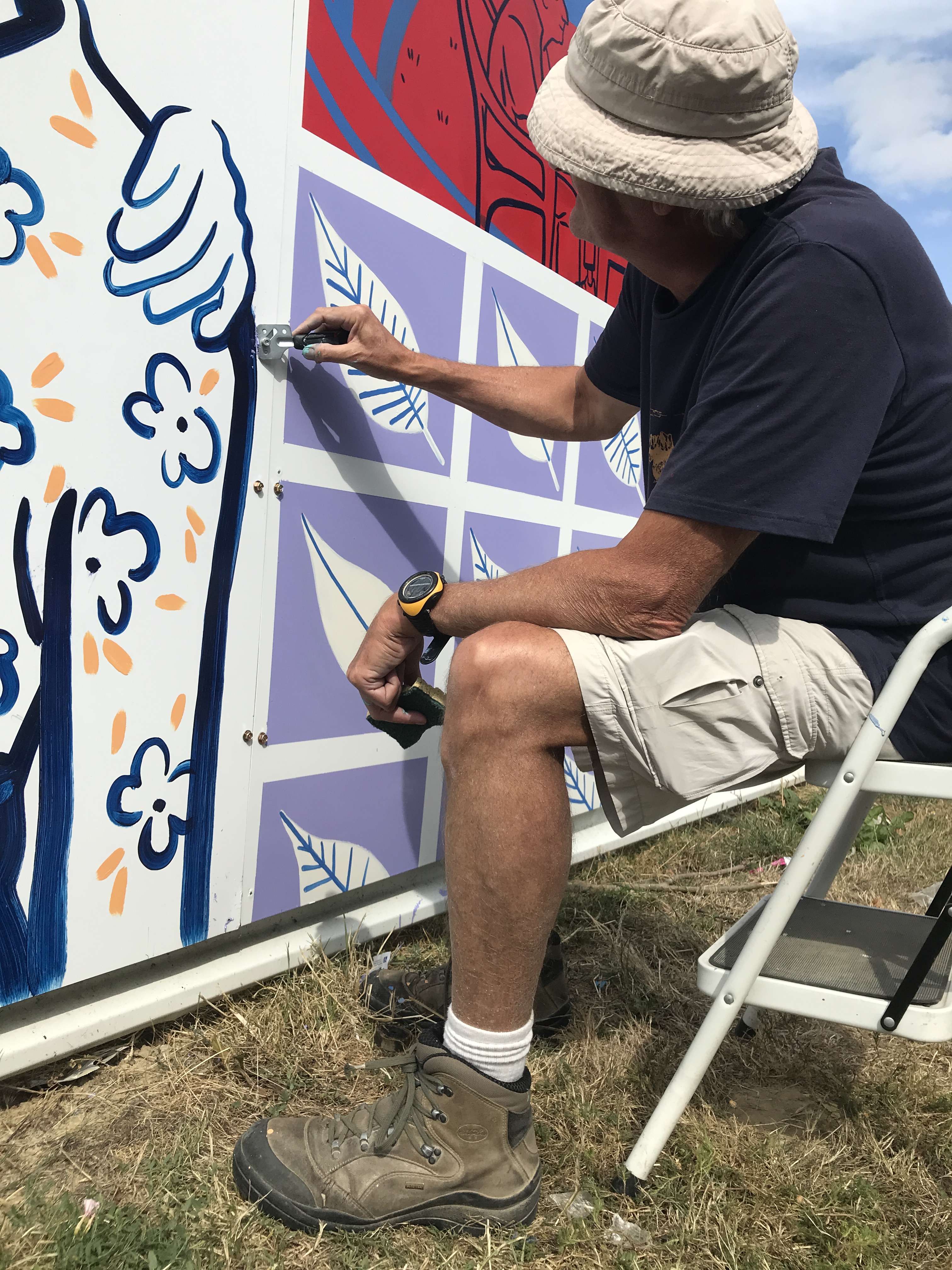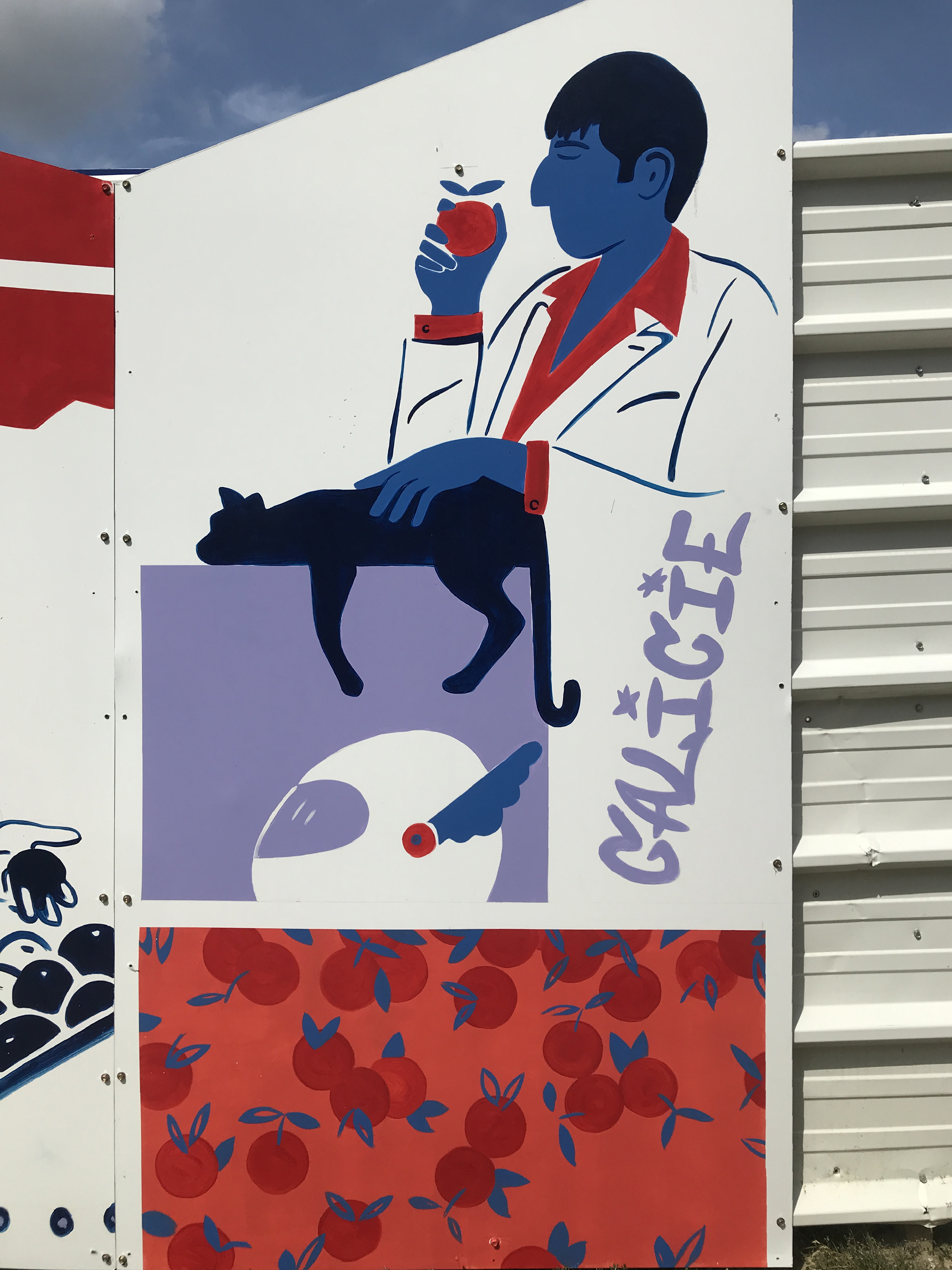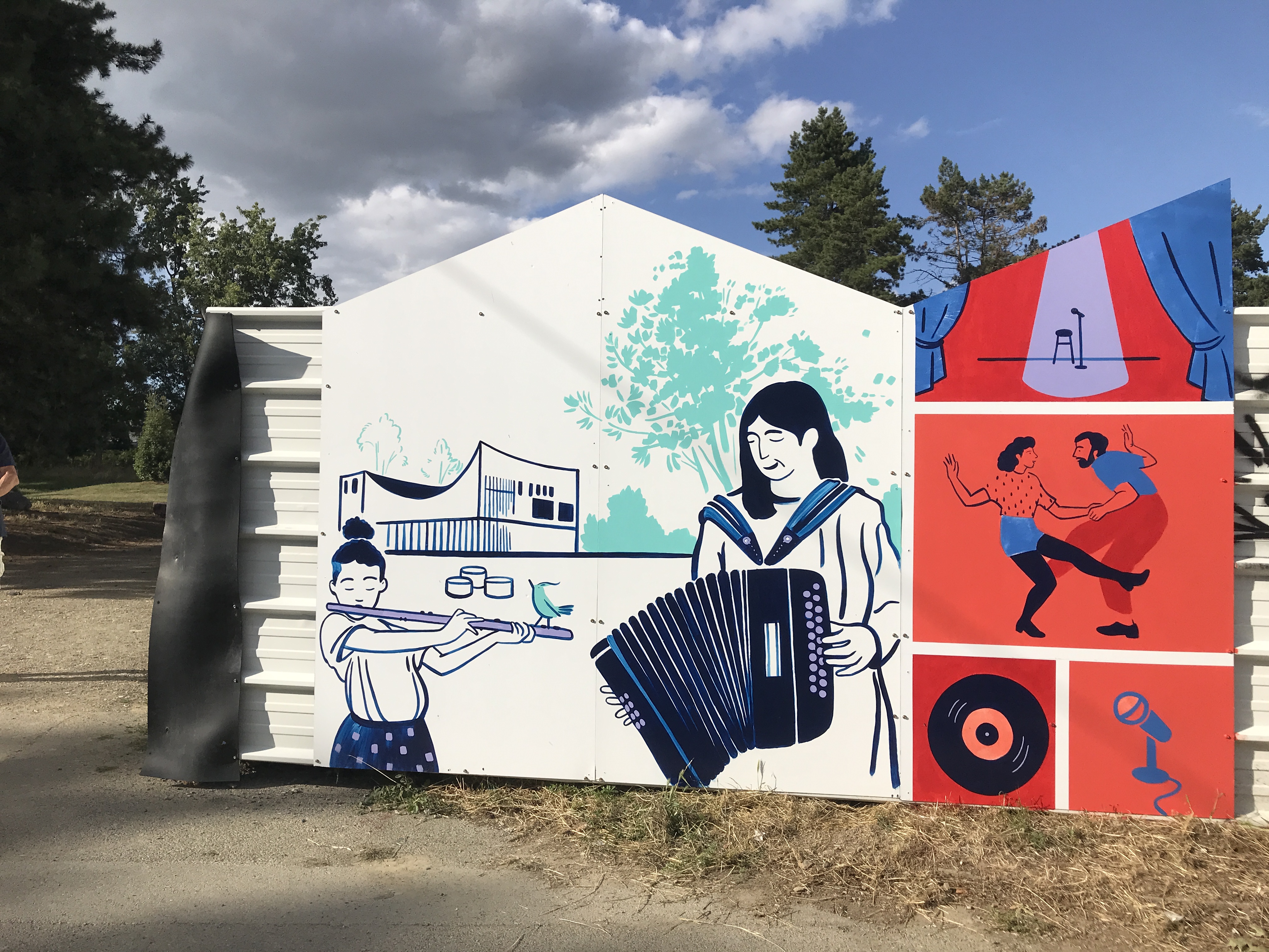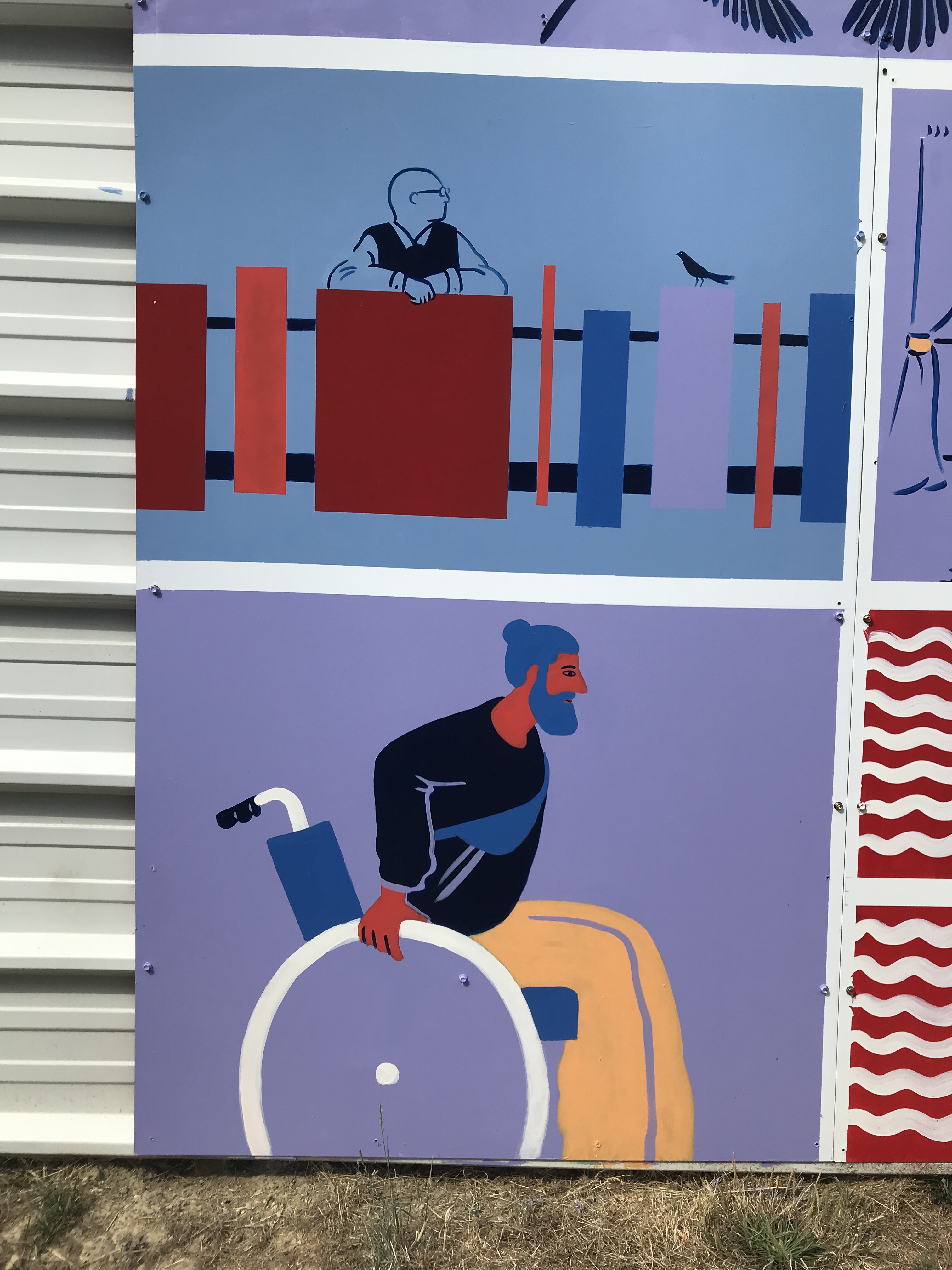 Afin d’illustrer la richesse du quartier et de tous les sujets qui l’animent, nous sommes parties sur l’idée d’une mosaïque géante, sorte de planche de bande dessinée monumentale, nous permettant d’évoquer une multitude de sujets. Des cases aux formats variés, peintes à des hauteurs différentes pour les adultes et les enfants. Ces images apportent du détail afin de ne pas lasser les personnes qui passent tous les jours devant.