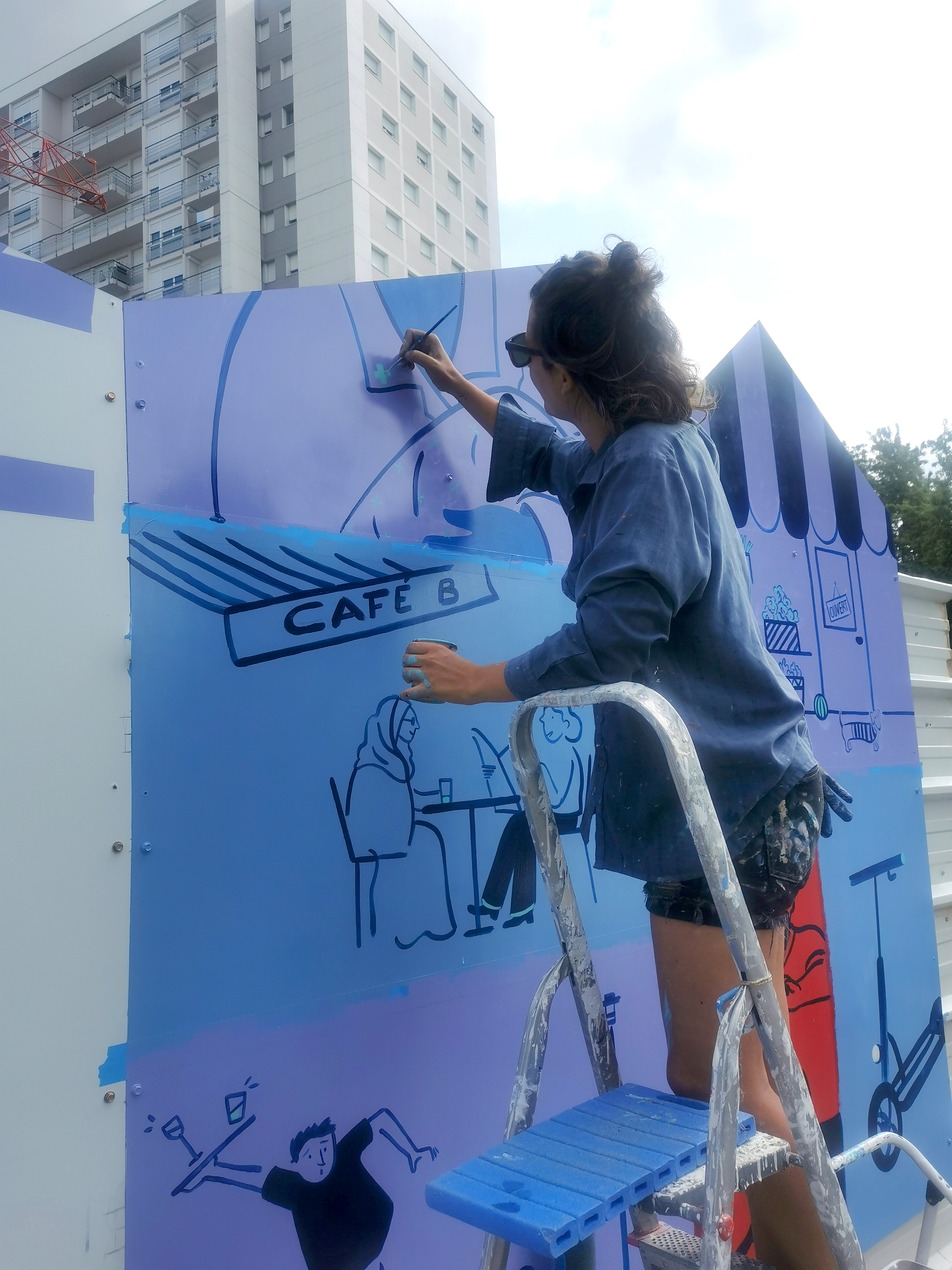 Nous avons représenté des scènes de vie préfigurant l’animation artisanale et commerciale des lieux à venir. Nous imaginons de grands éléments (personnages, arbres…) visibles de loin, afin de plonger les passant.e.s directement dans la fresque.