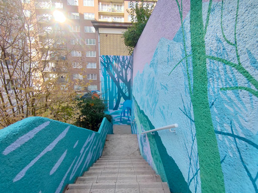Après un vote des habitants.tes du quartier sur différents sujets proposés, le thème de la nature a été retenu. L’idée est d’apporter de la gaieté grâce aux couleurs, ainsi qu’un horizon s’ouvrant sur les montagnes afin d’éclairer et d’agrandir le passage. Les passants.tes sont plongés dans une ambiance douce et colorée le temps de passer d’un square à l’autre.