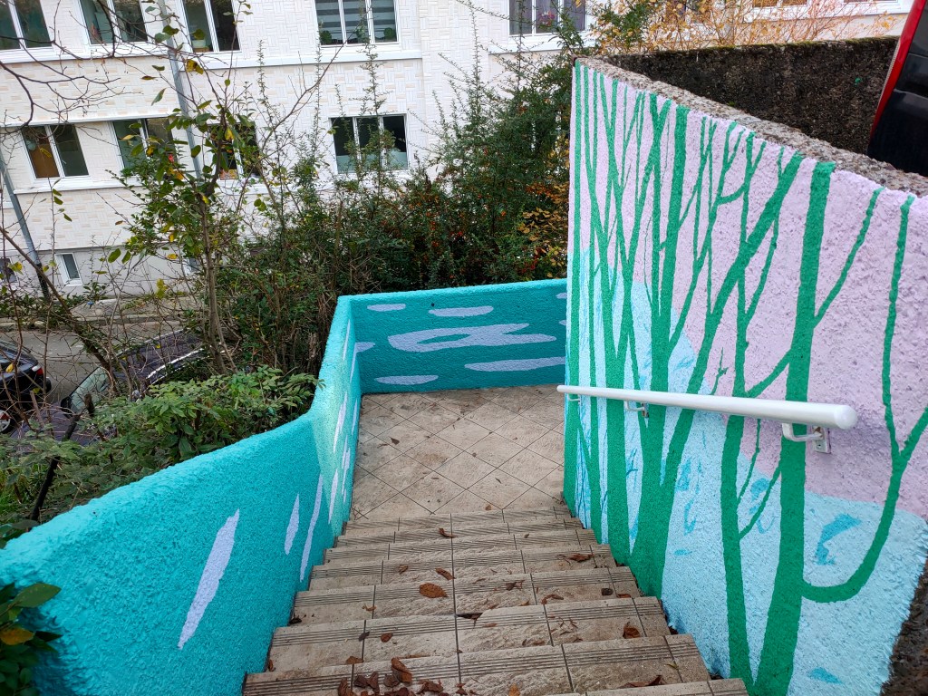 Cette fresque s’inscrit dans la continuité des projets que nous avons déjà réalisé dans le quartier du Bempt à Forest. Grâce à la participation de Habitat & Rénovation, nous avons embellie les murs situés dans la cage d’escaliers qui relient les différents squares.