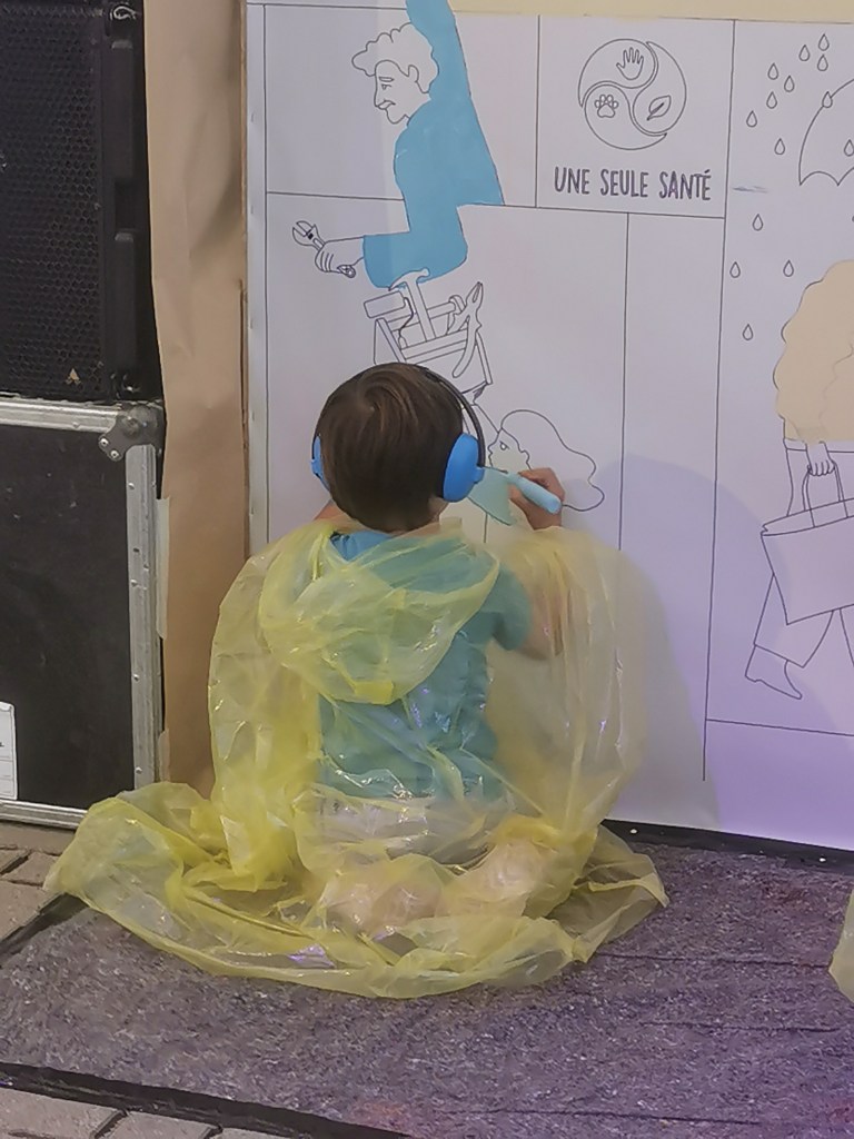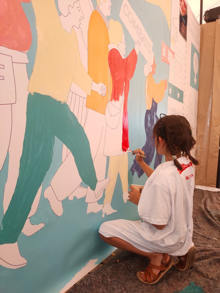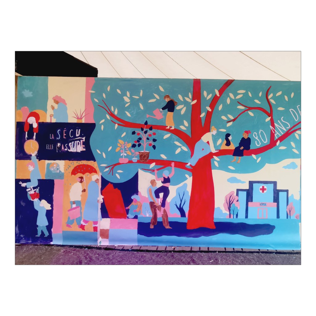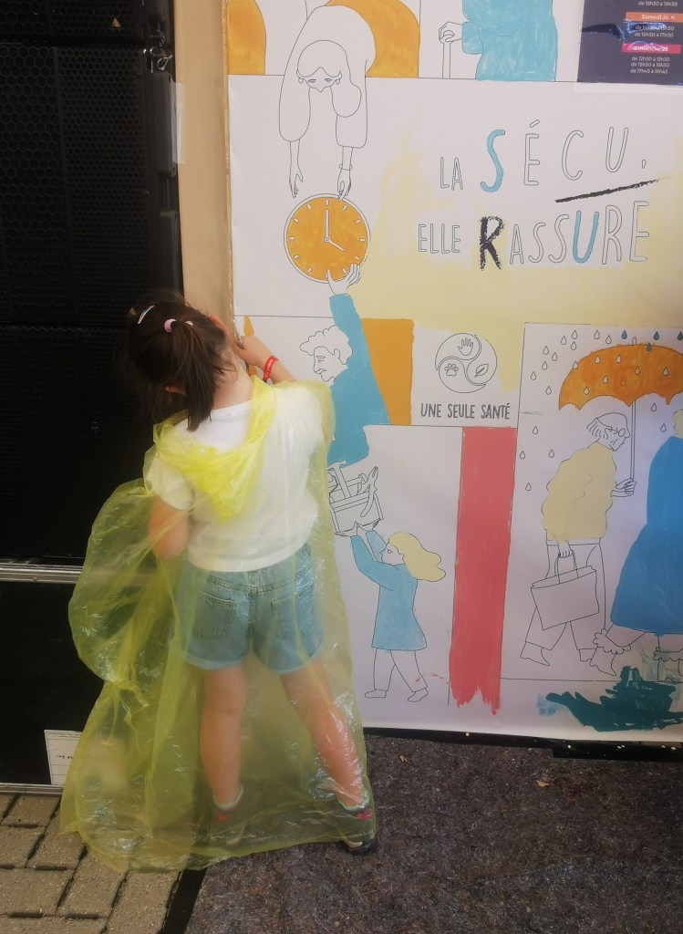 De part et d’autre de la scène, deux fresques participatives ont été réalisées avec l’aide des participant.e.s tout au long du festival. L’ une rend hommage aux luttes ouvrières qui ont permis la création de la Sécurité sociale en Belgique, l’autre représente l’arbre de la sécu qui nous protège tous.
