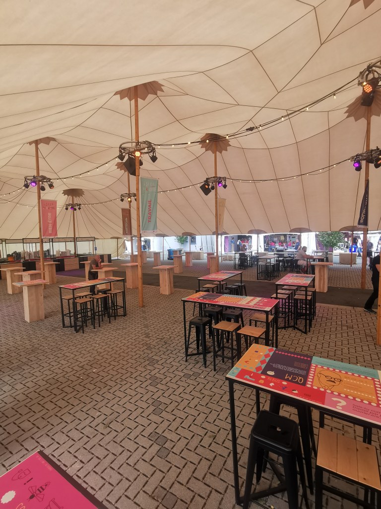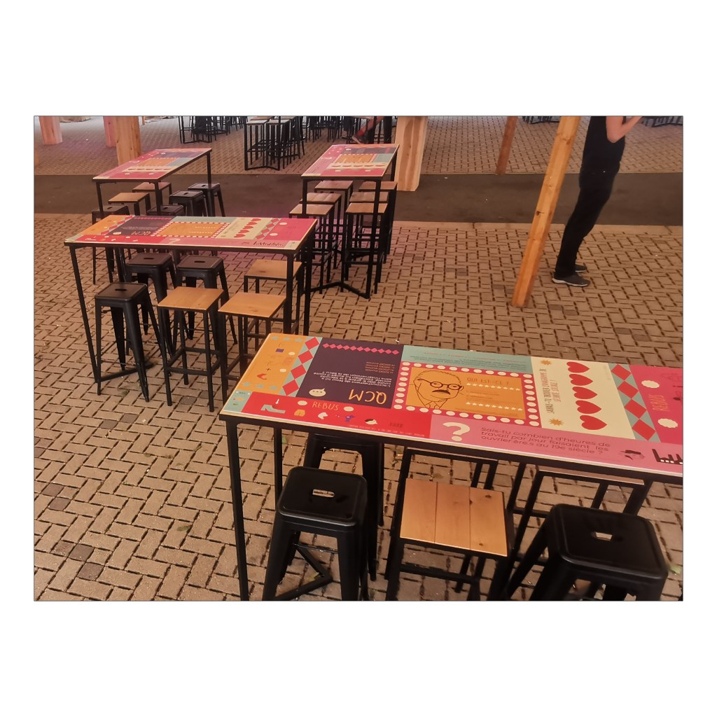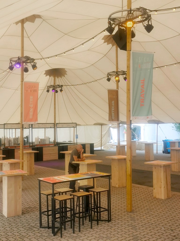Nous avons intégré des planches de jeux sur les plateaux des mange-debout pour offrir une approche ludique et conviviale, permettant aux festivalier.ère.s d’en apprendre plus sur la sécu tout en s’amusant ! Avec Achille Van Acker et Charlotte Hauglustaine, figures marquantes de l’histoire de la sécurité sociale.