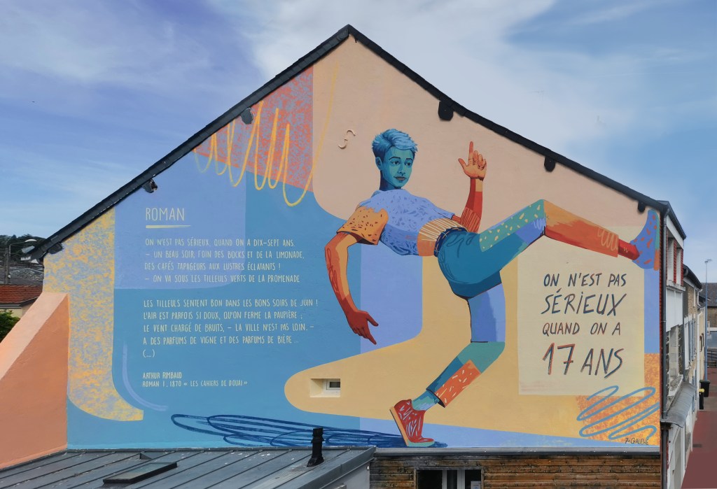 Charleville-Mézières, ville natale du poète Arthur Rimbaud, diffuse aujourd’hui l’œuvre et les textes du poète en inscrivant des extraits de poèmes illustrés sur les murs de la ville. Plusieurs œuvres murales sont réalisées formant le « Parcours Rimbaud ».