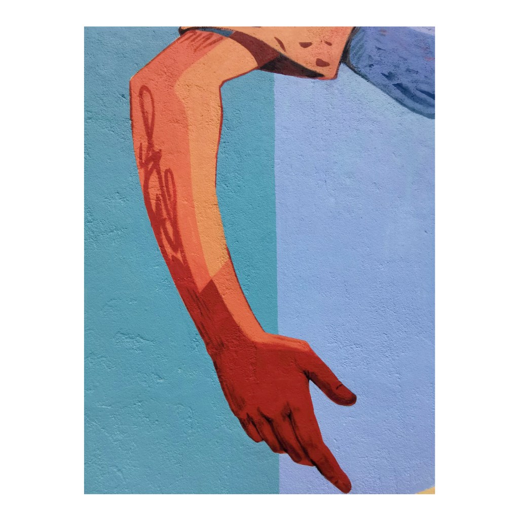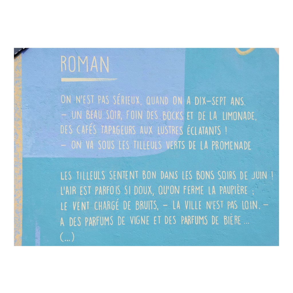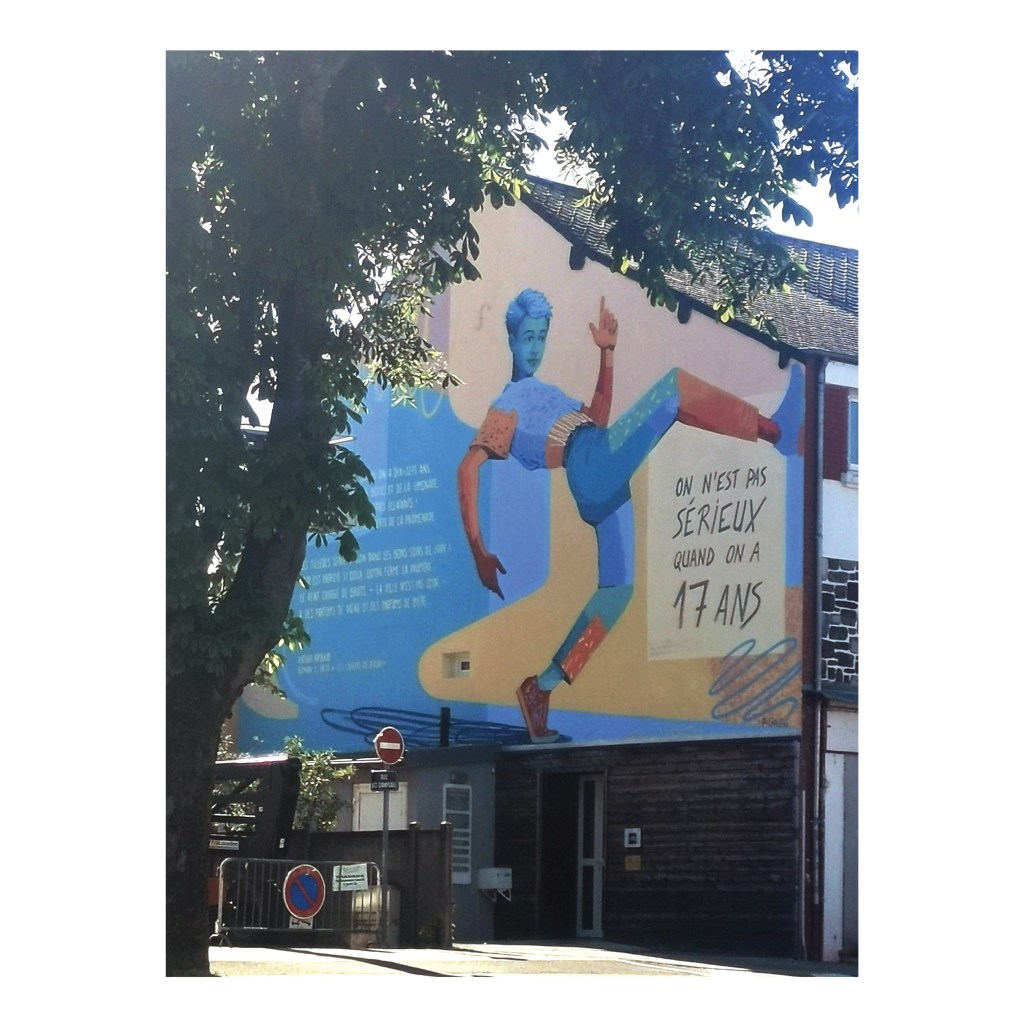 La posture dynamique du personnage, comme une photographie d’un mouvement suspendu est prétexte pour encadrer ce vers. Le personnage est un Arthur Rimbaud moderne, représentant notre époque. Il pourrait être également n’importe quel.le adolecent.e habitant le quartier.