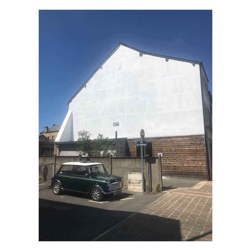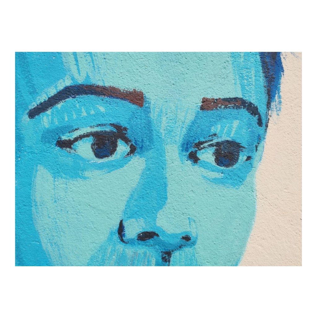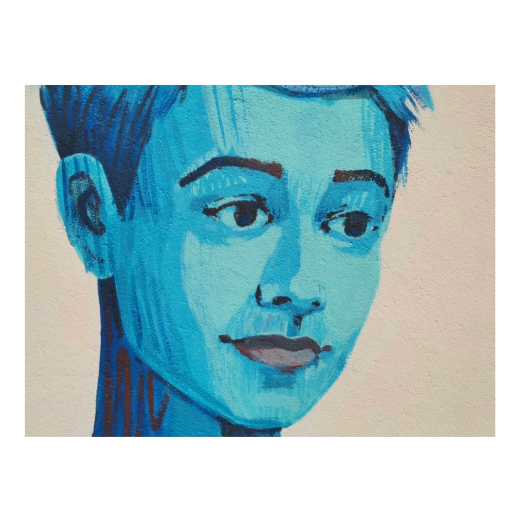 La posture dynamique du personnage, comme une photographie d’un mouvement suspendu est prétexte pour encadrer ce vers. Le personnage est un Arthur Rimbaud moderne, représentant notre époque. Il pourrait être également n’importe quel.le adolecent.e habitant le quartier.